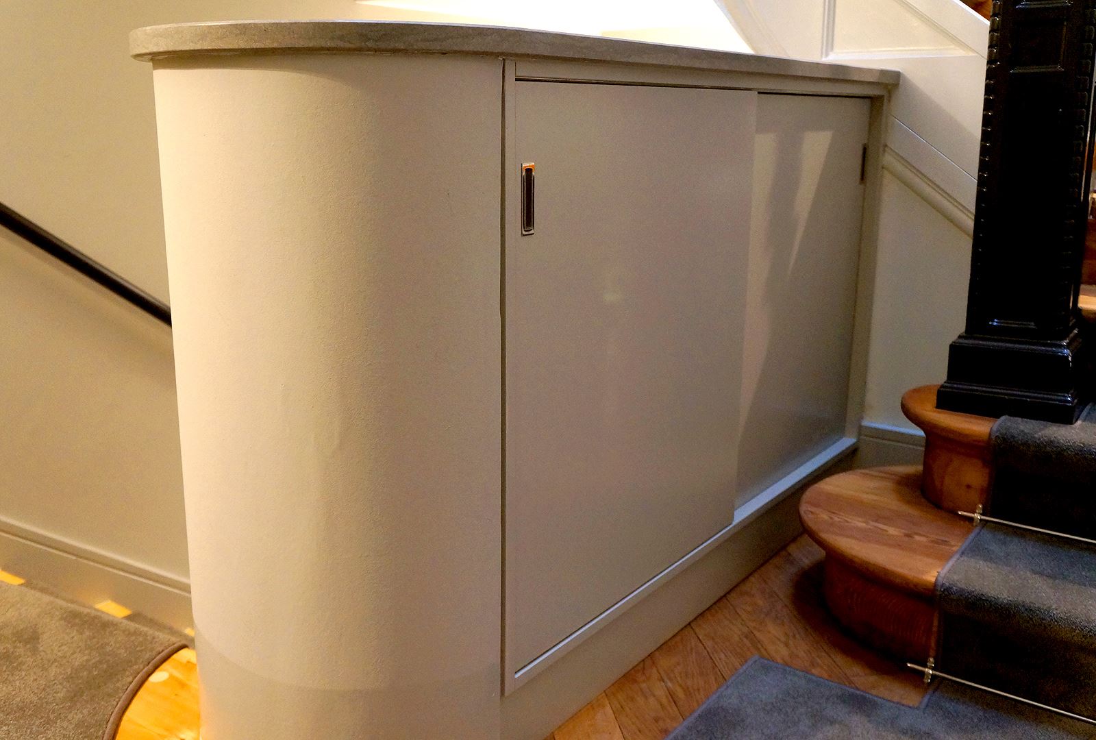 Wie Sie sehen, gehen wir, wo immer es möglich ist, über das pure Verstecken hinaus. Gerade wenn Objekte wie Heizkörper frei an einer Wand befestigt sind, schaffen wir einen dekorativen und praktischen Mehrwert durch Ablageflächen auf der Verkleidung oder sogar einem Bücherregal. Vielleicht gibt es aber auch noch andere Dinge stilvoll zu verschönern, wie etwa Treppengeländer? Was wäre naheliegender, als die Aufwertung der Optik mit der Schaffung zusätzlichen Stauraums zu verbinden?